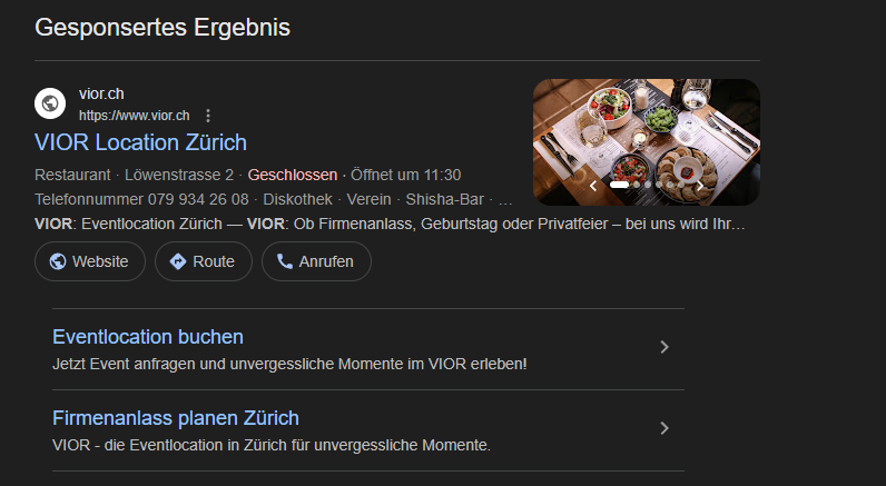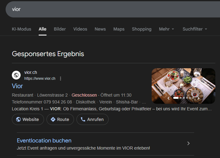 Regelmässige Auswertung, Anpassung der Gebote, Suchbegriff-Checks und Qualitätsfaktor-Optimierungen, um Sichtbarkeit und Effizienz stetig zu steigern. - Das Resultat: Ein sauberes Set-up, das Vior erstmals als Restaurant und Business-Spot sichtbar macht.